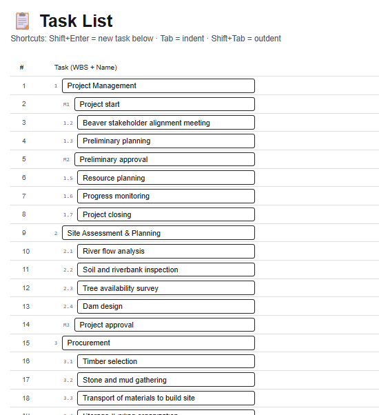 Tasks are automatically numbered, and milestones use a distinct visual coding.