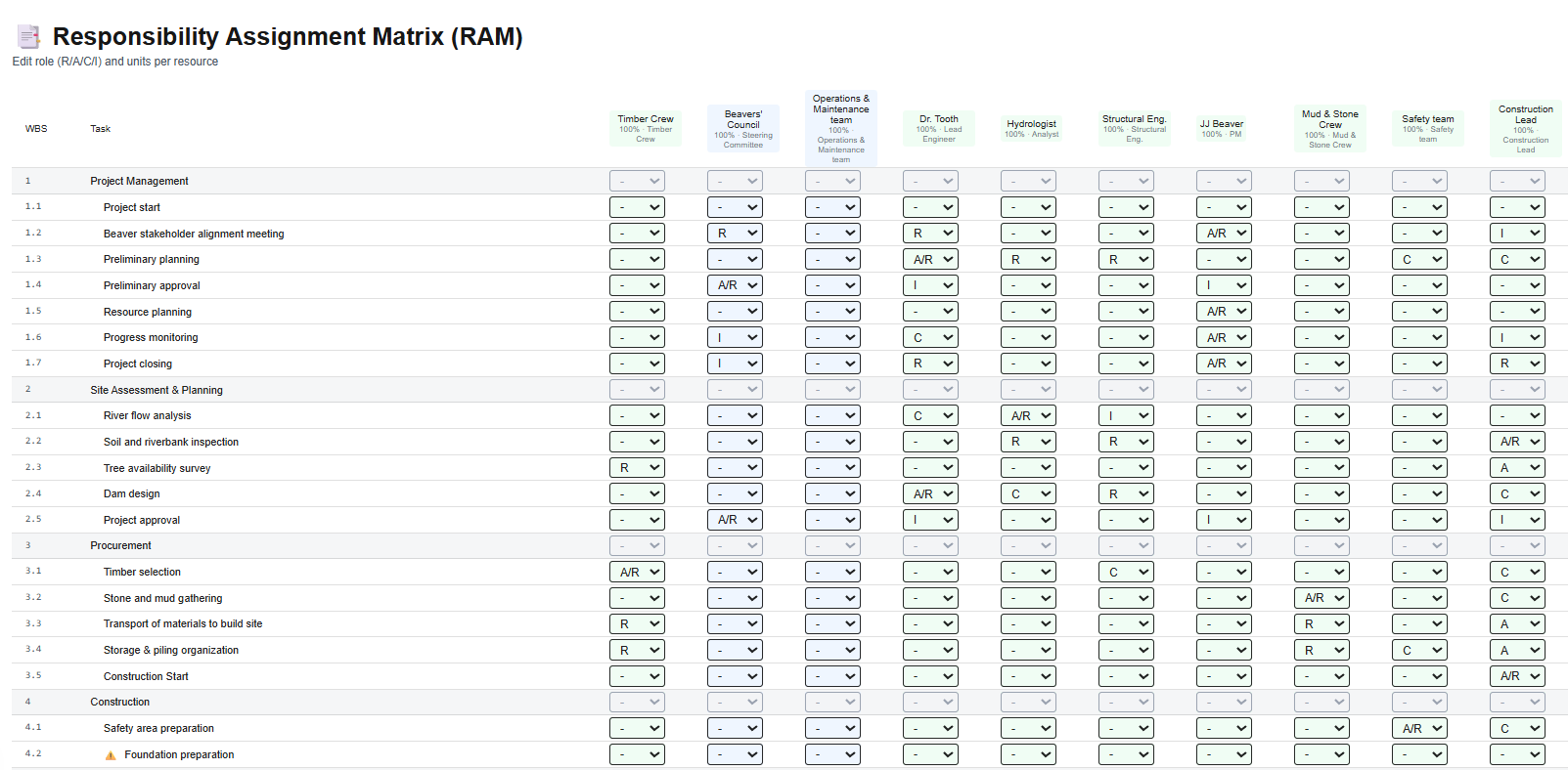 Quickly compile the Responsibility Assignment Matrix (RAM) using RACI or RASIC conventions, ensuring that every task has a clearly defined accountable and/or responsible role.