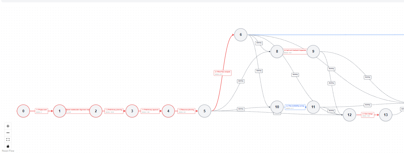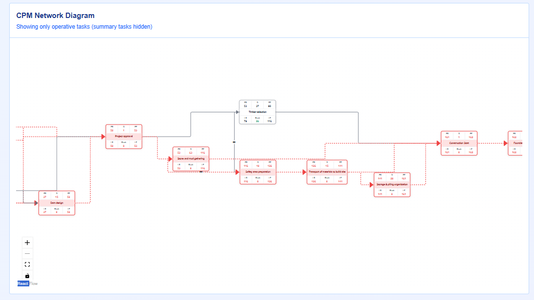 This section generates the Network Diagram and highlights the Critical Path calculated using the Critical Path Method (CPM).